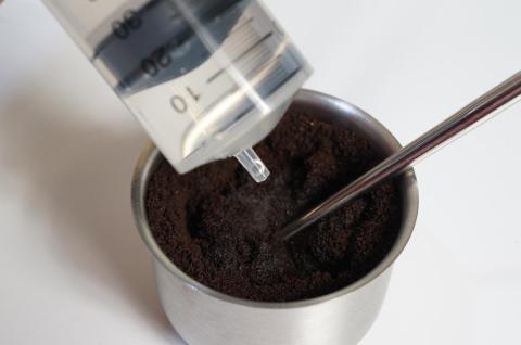 - 湿らせる水は、30mlくらいがよいようです(説明書に分量の指示はありません)。コーヒーパウダーの条件によって湿らせるための水の量は異なると思われますが、これより多いと水がパウダーに染み込む前にバスケットの下から漏れ出ます。