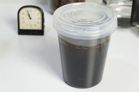 600mlの密閉容器に、40gのアイスコーヒー用の深煎り細挽きの粉(上記 フレッシュロースター「アイスコーヒー」)と350mlの水を入れ、ダマがなくなる程度に静かにかきまぜ、8時間ほど常温で放置しました。