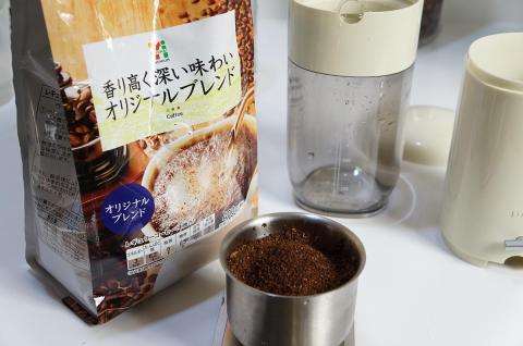 今回は、この自動コーヒーメーカーのミル機能で挽く細かさを4段階に調節できるうち最も細かい設定にして、自動動作を強制停止して挽いた豆を取り出し使用しました。