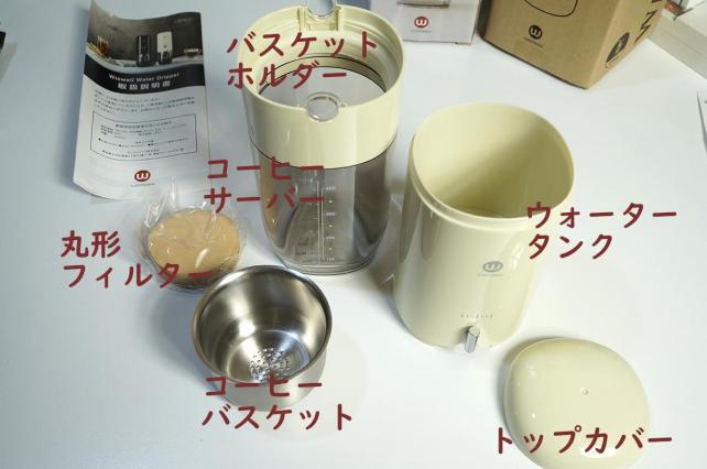 下から、コーヒーサーバー、バスケットホルダー、コーヒーバスケット、ノズルとコックシャフトをセットしたウォータータンクの順に重ねます。