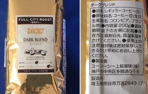 今回はイオン系のスーパーで扱っているUCCのダークブレンドを使いました。フルシティーロースト(深煎り)になります。苦味が強く酸味が控えめなのが特徴です。