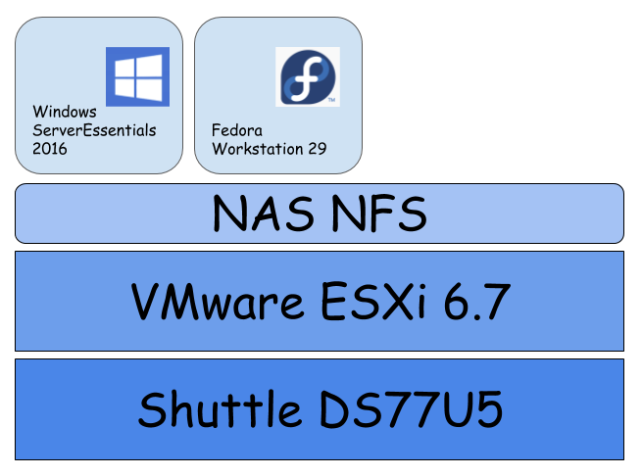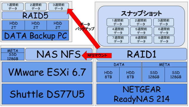 ESXiの設定情報をエクスポートしておけばOS欠損してもすぐに復旧出来ますし、仮想化PC上に重要データは無いのでディスク障害の考慮はNAS側だけに集中出来ます。