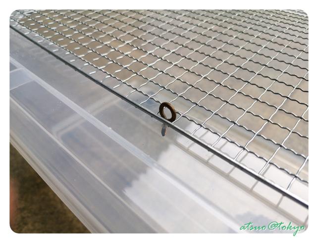 加工したのはフタだけで、100円ショップで購入してきたバーベキュー網より小さめに穴を空け、網の片側を結束バンドで固定し網を片開き出来るようにしています。
