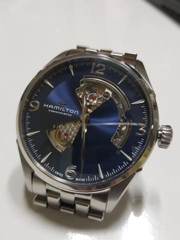 また、ハミルトンでは珍しいブルーの文字盤も大きな特徴ですが、これが微妙に赤味がかかった色で光の当たり方によっては紫に近い色にもなります。