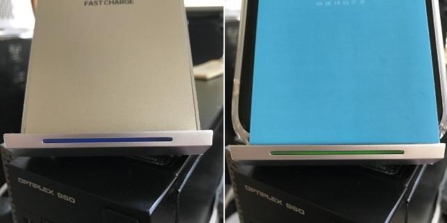 通電状態だけだと青色のLED表示。スマホを置いて充電が始まると緑色に変わります。