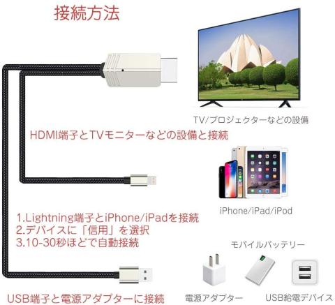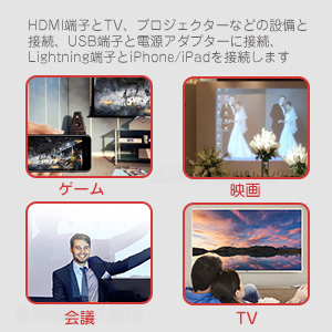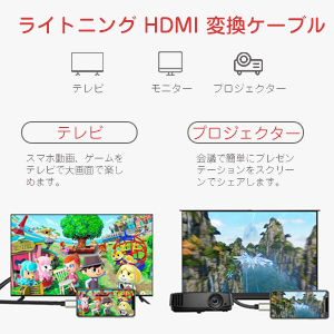 iPhone / iPad 画面をTVに転送するライトニングHDMI変換アダプタです。iPhoneやiPadなどアップルデバイスから映画、YouTube、写真、ビデオなどをHDMIインターフェース搭載のTV、プロジェクターに移して、大画面でご家族やお友達とシェアします。重いパソコンが要らない、会議で簡単にプレゼンテーションをスクリーンで同僚に表示できます。面倒な手間はなく、簡単に使えます。