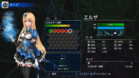 主人公のステータスは、前項の立ち絵の横にある能力チップの装備と、アクションスキルの習得、攻撃スキルの取得、レベルアップ、装備品や能力チップの強化などで構成されています。