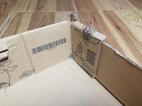 深さを変えなければ、4つのカドの形状はそのまま使えます【⇦ ここ ポイント】。 - ありあわせのダンボール箱を展開し、必要な大きさ(870 x 550 mm)に切り出します。足りなければ切ったり折ったりする位置をなるべく避けて継ぎ足します。