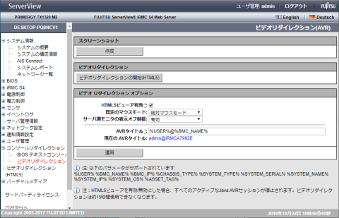 リモートからサーバ本体のキーボード、マウスの操作およびディスプレイへの表示内容を確認する ことができ、サーバ本体をリモートから操作できる機能です。