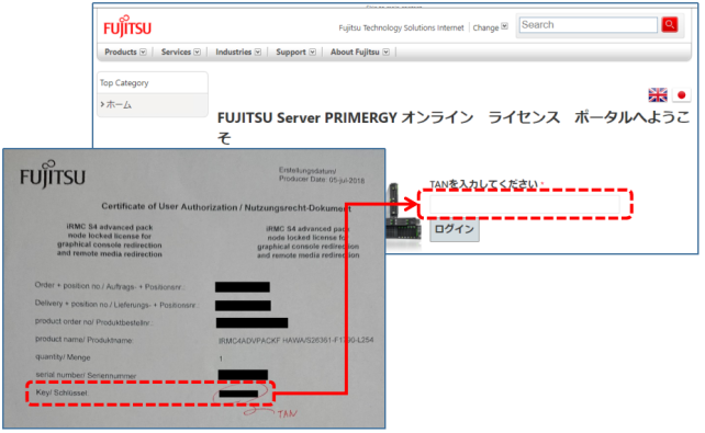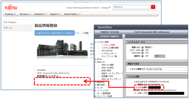 無難にシリアル番号かなと思い、iRMCのWEBコンソール上に表示されている番号を入力しました。