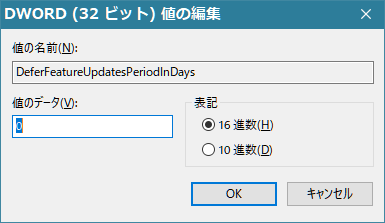 コンピューター\HKEY_LOCAL_MACHINE\SOFTWARE\Microsoft\WindowsUpdate\UX\Settings¥DeferFeatureUpdatesPeriodInDays」の値を「0」(ゼロ)にする必要が有る