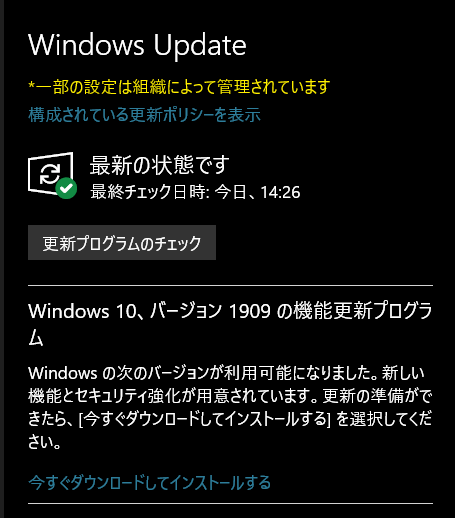 「更新プログラムのチェック」ボタンをクリックすると1909が出てきました。