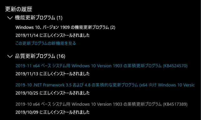 11月定例の1903向け「KB4524570」の累積アップデートでは異常に時間が必要であった。