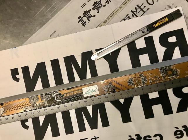 改めてスティックのりを使って 裏文字印刷したA4シートを貼り付けて カッターナイフで切り分けることにしました