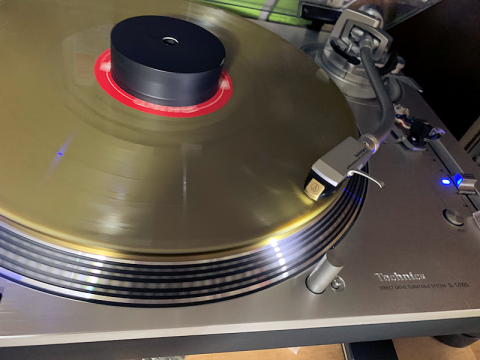 注目のゴールドLPですが、これも色にむらが出てしまい、あまり良い仕上がりではありません。もっとも、レコードは元々熱して柔らかくした塊を押しつぶしてプレスしますので、よほど均一に色素が混ぜられていない限りはこうなってしまうのは仕方ない訳ですが。
