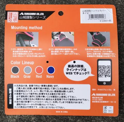 山城謹製ハンドルカバーです。なんとか謹製って付くと高級感が増しますが、株式会社山城という会社の製品の様です。