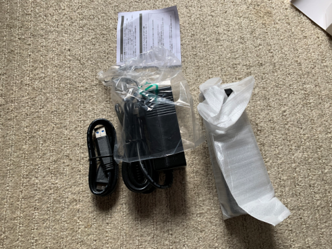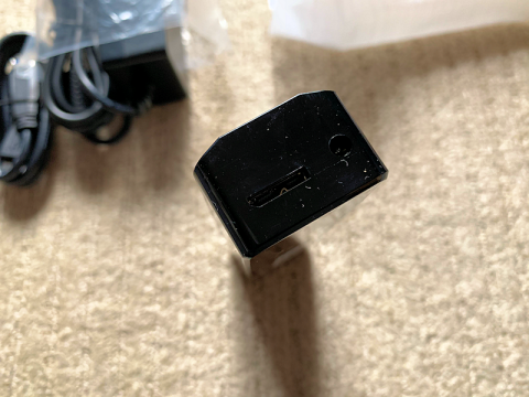 本体以外には、ACアダプターとUSB3.0 A-microUSB 3.0 B端子ケーブル、簡易マニュアルが添付されていました。