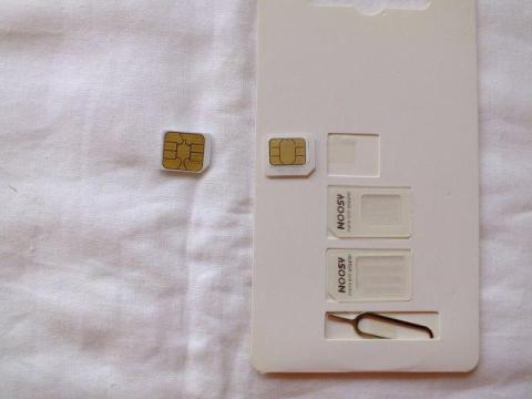 左:MicroサイズのSIM 右:nanoサイズのSIMを、Microサイズに変換するアダプターにIN