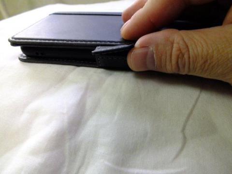 マグネット入りのベルトは、スマホのボタンを邪魔しない位置に小さく装備。