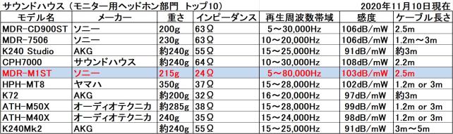 成田のサウンドハウスのHPで「モニターヘッドホン」部門TOP10の仕様をまとめてみました。