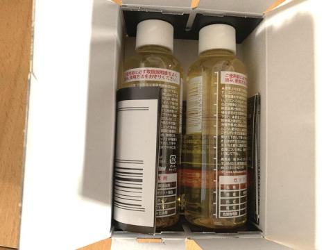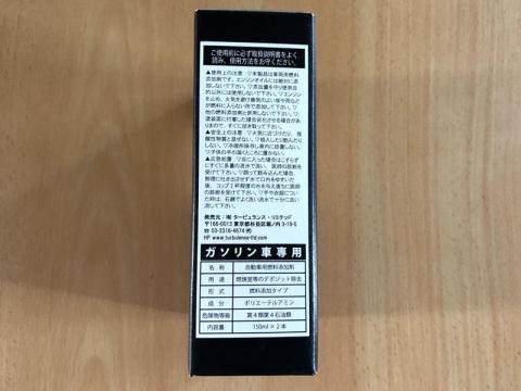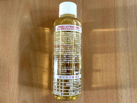 外箱も中身も、もはや見慣れたものです。一応中に分量等が記載された説明書が入っているのですが、今回は結構カーボンの付着が進んでいることが予想されたため、少し濃いめとなるよう、ガソリンをある程度使った状態で1本をすべて投入します。