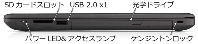 右側面には、手前から電源とアクセスランプのLEDインジケータ,SDカードリーダー,USB 2.0が1基,光学ドライブが搭載されていて、背面には何もありません。