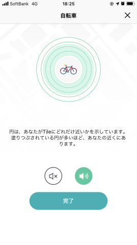 アプリ画面で近くにあるかどうかが塗りつぶされた円で判定できるほか、Tile自体が音を鳴らすので、そちらでも分かるようになります。