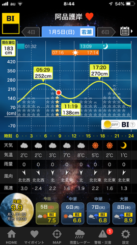 タイドグラフ内には、魚の釣れやすさを示したBI(爆釣指数)を★のイラストで表示します。BIは1時間ごとに表示されるので、★の数を目安に釣れやすい時間帯を確認できます。