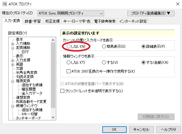 日本語変換ソフトに『ATOK』を使用してる場合はエラーが出てベンチマークを回すことが出来ません。 なので、ATOKのプロパティから変換補助→表示をクリックし、「カーソル位置に入力モードを表示しない」に設定します。