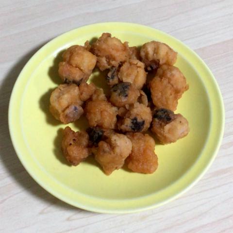 「揚げダコ」の場合も油が跳ね易いので、必ず片栗粉を使います。