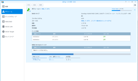 ① DSMを起動し、ストレージマネ-ジャで不良のドライブを確認し、シャットダウンして当該のドライブを新しいドライブと交換し、電源を入れて完了です。