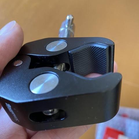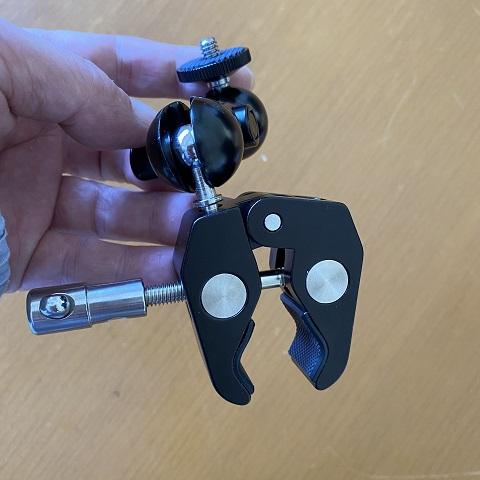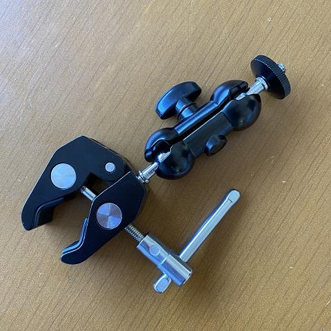 材質はメタル製で丈夫そうです。パイプとか近くにあれば、それにクランプしてしっかり固定。