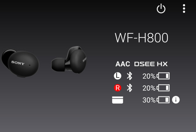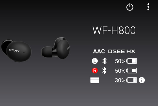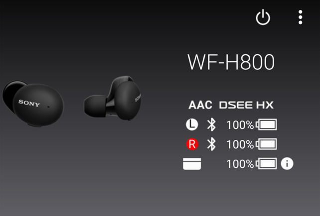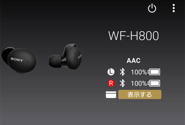 上記は、フル充電の状態で、スマートフォンアプリからWF-H800を選択した場合の画面です。