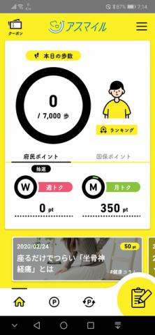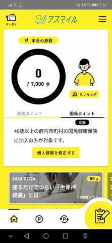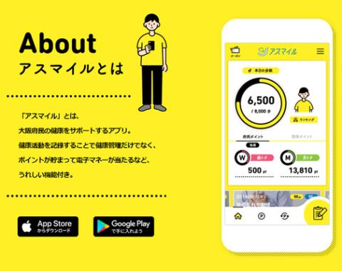 大阪府が推進している「おおさか健活マイレージ」のスマホアプリ「アスマイル」です。