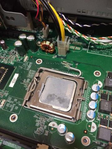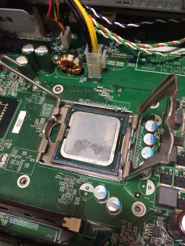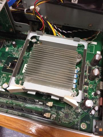 ヒートシンクを外して、CPUを取り外していきます。奥の金属金具を起こすと金属の固定カバーを外すことができます。