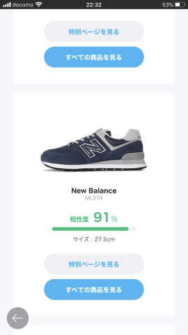 左右別々の計測値 オススメの靴が表示された