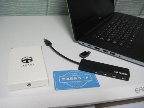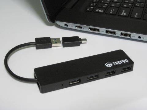 バスパワーUSB3.0ハブx4ポートなんだけど、TYPE-C変換アダプターが付属する。
