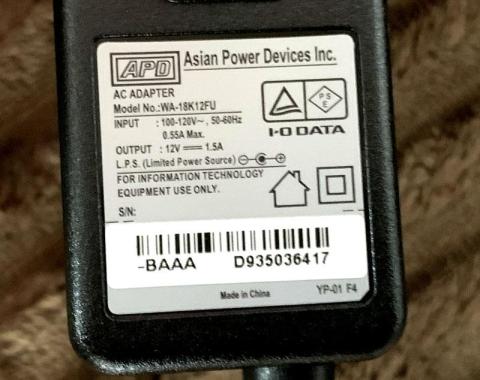 備忘録代わりに、ACアダプターの仕様を貼っておきます。12V 1.5A センタープラスですね。