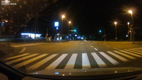 夜間のフロントカメラの映像です。信号機もLEDですが、点滅することもなくしっかり映っています。