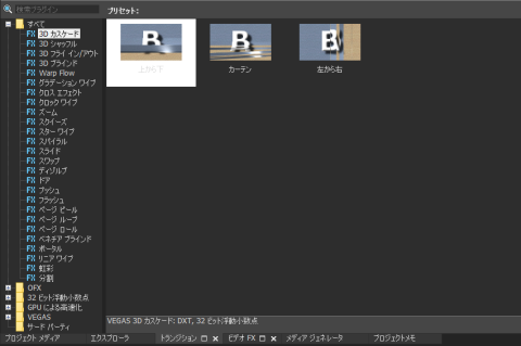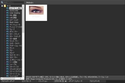 ↑ビデオFXも同様に左のカテゴリを選択し、右側のプリセットを選択して、タイムラインにドラッグすれば適用されます。