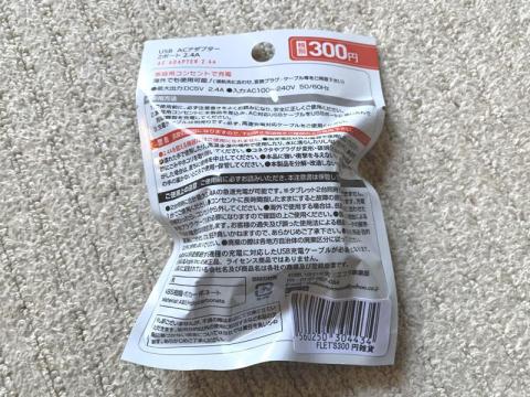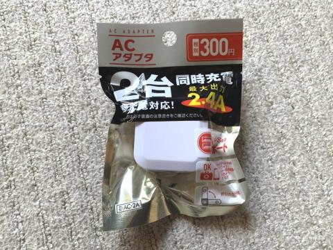 そこで近所のスーパーに入っている百均ショップで手頃なUSB - ACアダプターを探したところ、残念ながら100円では無かったものの、そこそこ割安と思える品がありましたので、それを購入してきたわけです。