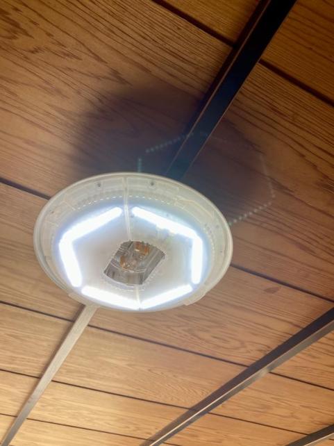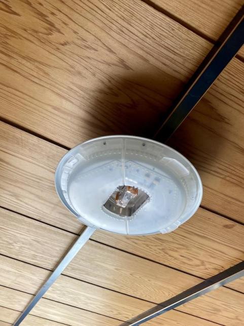 カバーを付ける前に点灯するのを確認 天井部に映る光の点はレンズの反射でしょう。