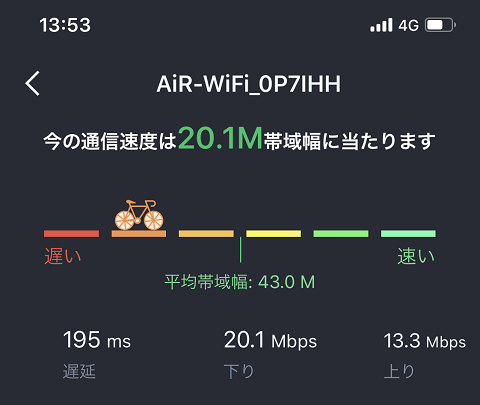 市内に戻ると速度は格段に上がるけど、最大速度150Mまでは出ませんでした。