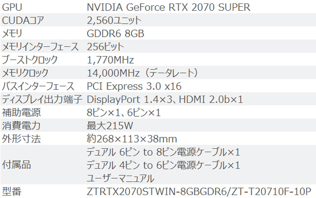 ZOTAC RTX2070 Super Twin Fanのスペックは、下記のとおりです。