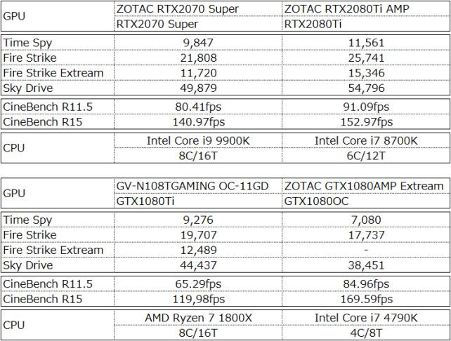 過去のGPUのスコアは購入当時のCPU及びメモリを使ったスコアですが、概ね、RTX2070 Superは、RTX2080Tiの75~90%のパフォーマンスで、価格はRTX2080Tiの35%程度です。