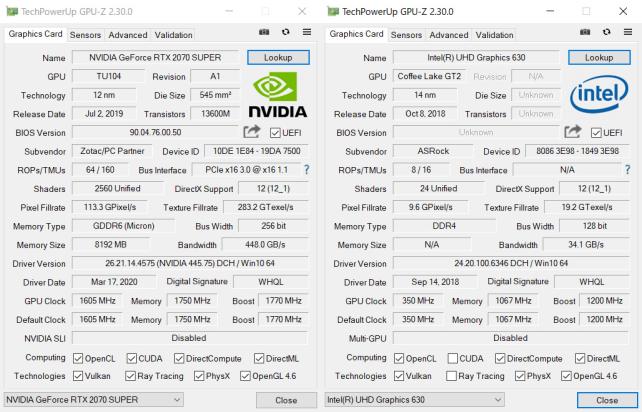 肝心の、パフォーマンスですが、GPU-Zで、RTX2070 Superと、CPU内蔵GPUを掲載します。