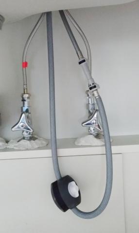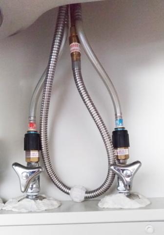 みず工房が止水栓にワンタッチカプラを付けていた関係で、止水栓までの湯・水ホースが止水栓迄届きませんでした。