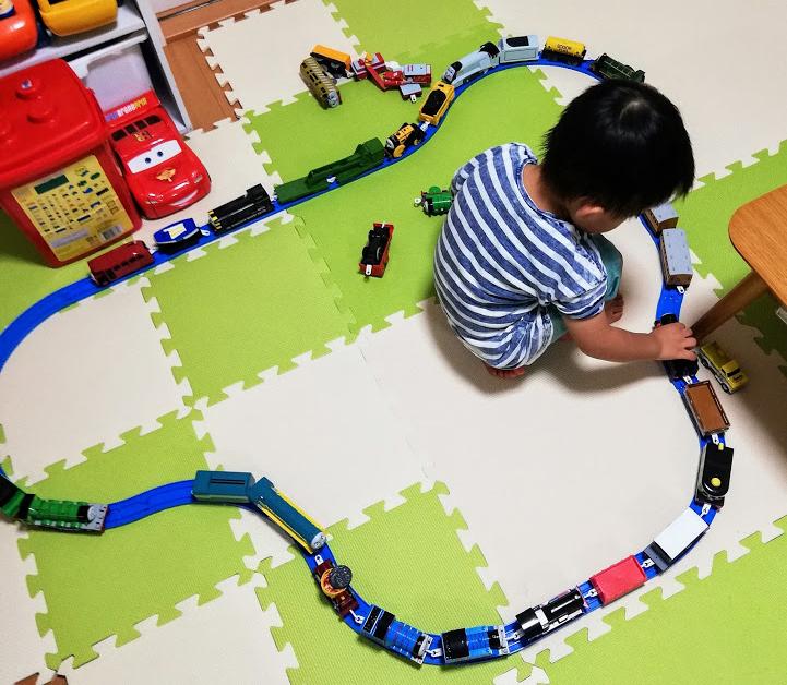 2歳前からトーマスにハマり、新幹線などの鉄道も大好きでプラレール(もらいもの)に夢中。