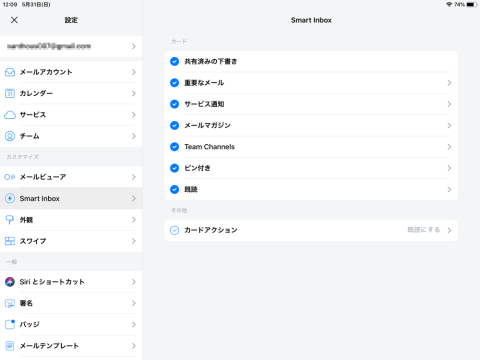 重要なメールはスマートインボックス機能で、一番上へ。ピン止めしたメールもその下へ。