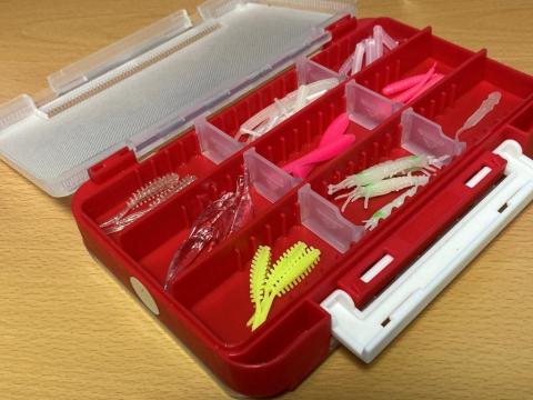 ワームはメバル、アジ用なので仕切り板を合わせると9種類は入れられます。